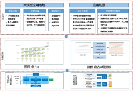 3. 应用层:支持常见的 NLP 应用比如多语言翻译、开放域对话等,支持预训练模型落地工具,包括模型压缩、框架移植、可持续学习,助力大模型快速落地。