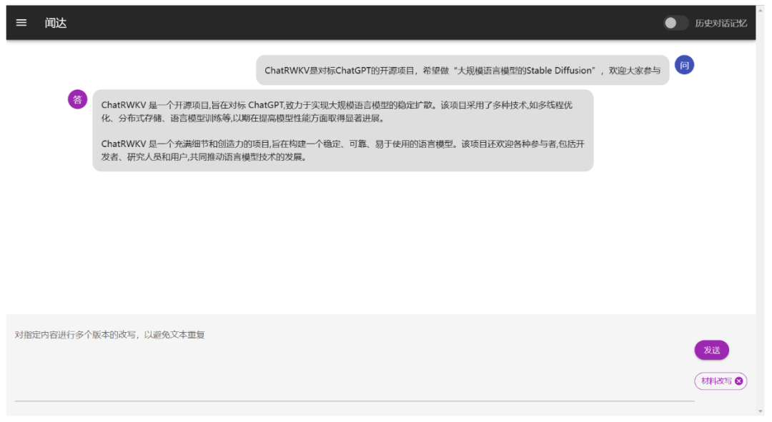 闻达:一个大型语言模型调用平台。目前支持 chatGLM-6B、chatRWKV、chatYuan 和 chatGLM-6B 模型下自建知识库查找。